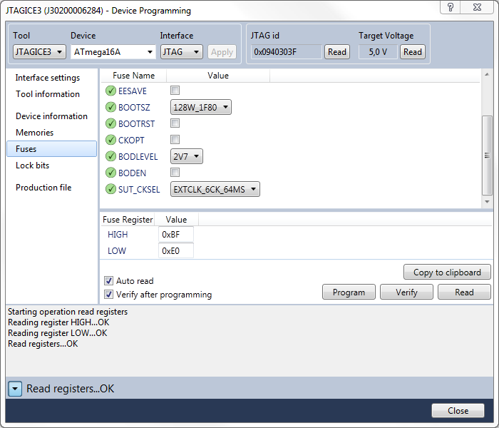 Under förutsättning att allt är korrekt inkopplat och rätt spänning påslagen kan man i Atmel Studio välja “Tools / Device Programming”. I dialogrutan som kommer fram väljer man Tool till JTAGICE3, Device till ATmega16A (eller vilken mikrokontroller man nu har), Interface till JTAG och klickar på Apply. Det ska sedan likna följande figur: