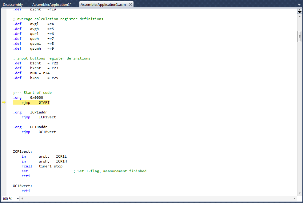 Efter detta kan man börja emulera (debugga) genom att välja "Debug / Start Debugging and Break" (eller tryck ALT + F5). Atmel Studio går då in i debug-mode och en gul pil pekar på den programrad som ska köras härnäst, ungefär som i figuren nedan: