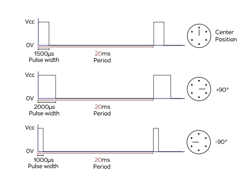 Pulsens längd avgör servots läge (se bild nedan). Pulsen måste återkomma med en viss period för att servot (som kan vara under belastning) ska kunna upprätthålla sitt läge.